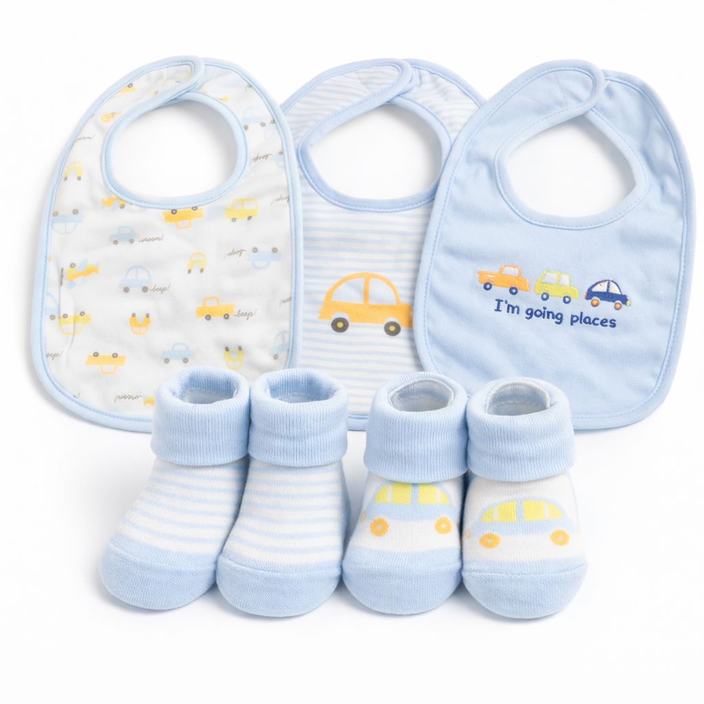 The information below is per-pack only Set includes coordinating bibs and socks Bib made with 100% cotton and socks made with cotton, nylon and spandex Bib made with multi-layered, gentle fabric to absorb drools and spills Optimal for everyday use Affordable, high quality value pack
