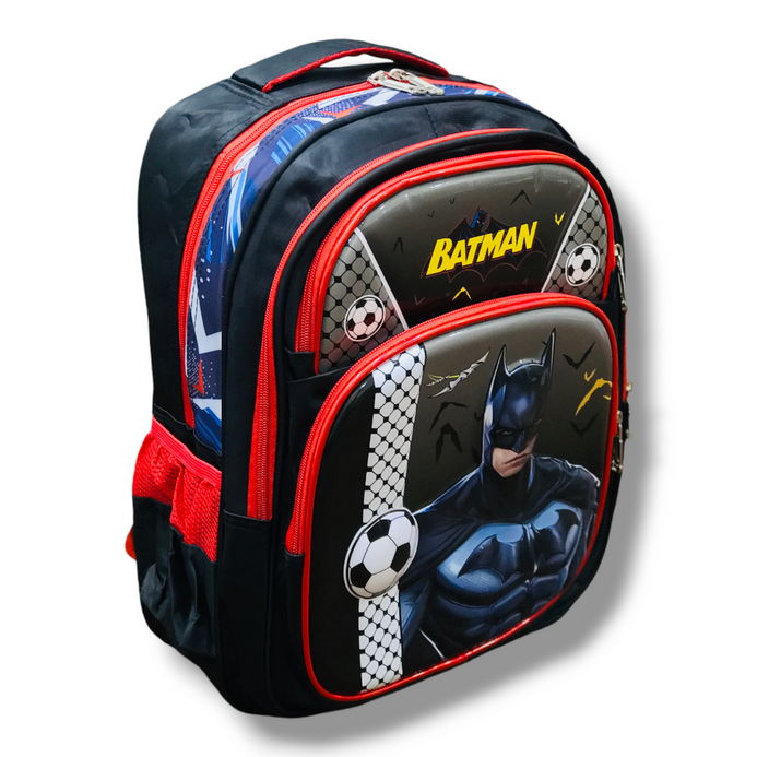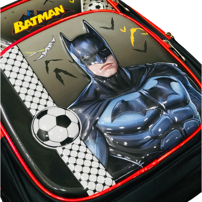 This 16 inch Batman school bag is the perfect way to keep your child's school supplies organized and their love of Batman close by. The backpack features a spacious main compartment with enough room to fit books, notebooks, folders, and other essentials. There is also a front pocket for smaller items, and two mesh side pockets for water bottles or snacks. The backpack is made from durable fabric and features padded shoulder straps and a padded back for added comfort. The Batman design is sure to turn heads, and your little superhero will love carrying this bag to school every day.
