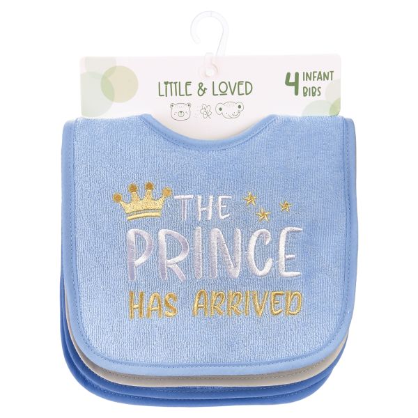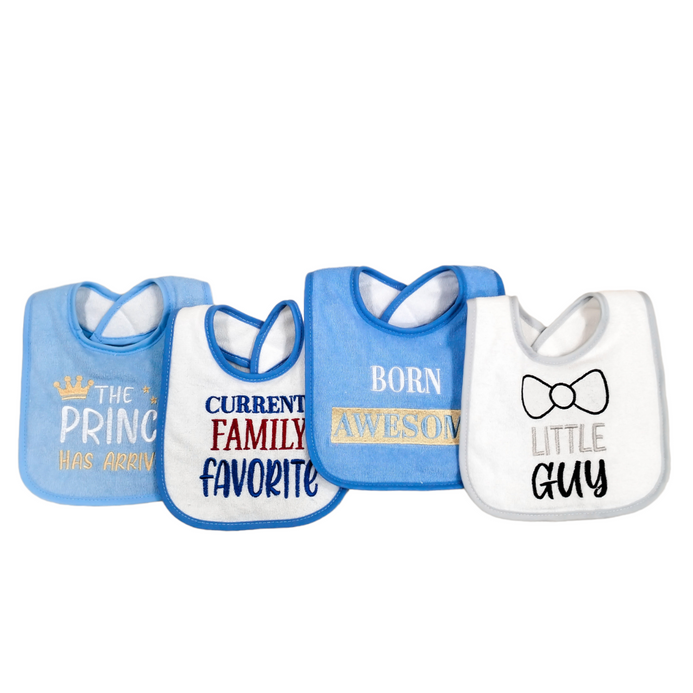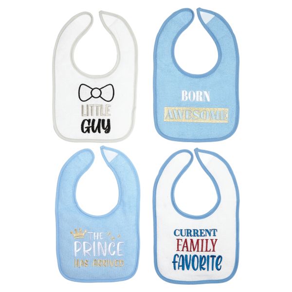 This pack of 4 fun drooler bibs are a great way to accessorize and keep your little one’s clothes clean! Made of cotton blend knit with PEVA backing. Bib measures about 6 inches from neck down.