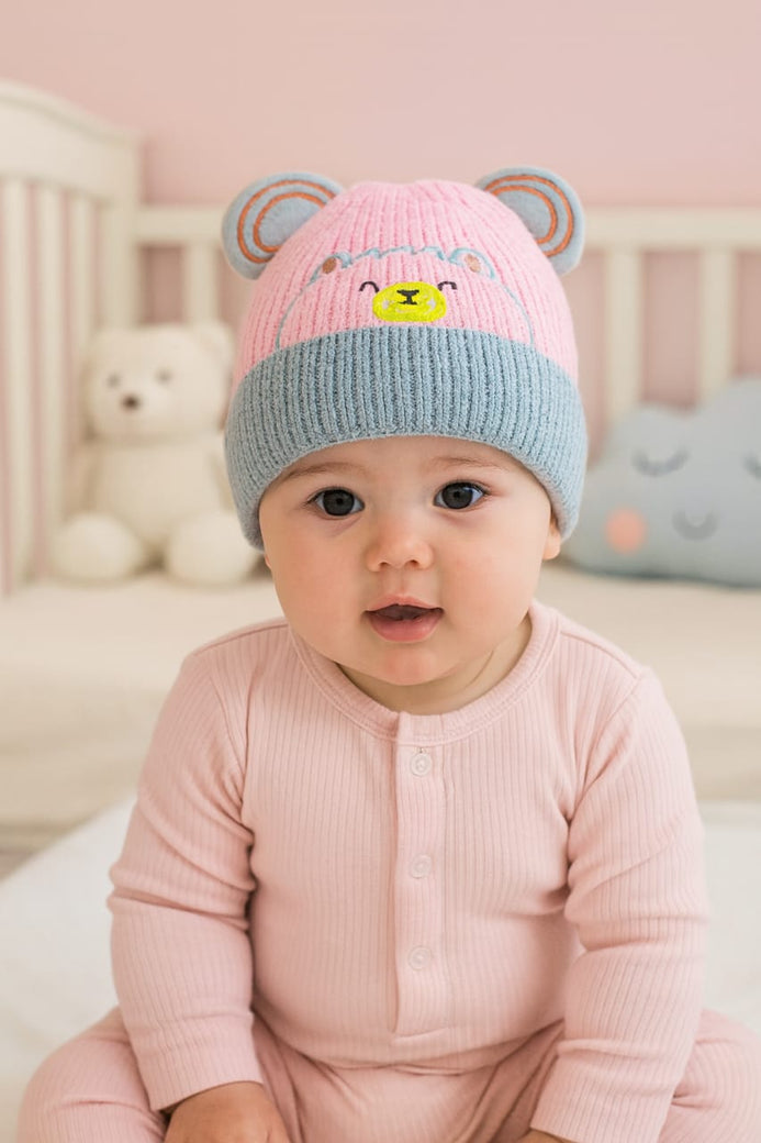 Gray Bear Head Embroidery Winter Woolen Warm Cap CP5072B Pink Bear Head Embroidery Winter Woolen Warm Cap CP5072A Blue Baby Winter Woolen Warm Cap CP5078B