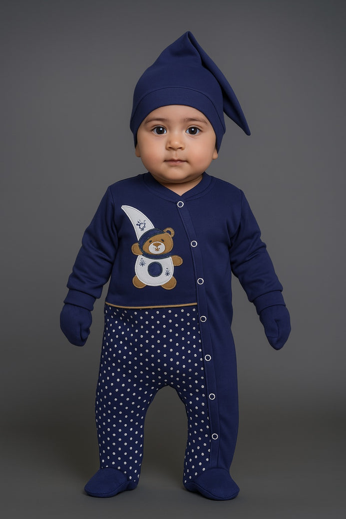 - 3 PCS Baby Blue Bear Character - Soft Ruffled Full Sleeve Romper + Cap + Gloves, Autumn/Winter Comfort, Dressy Style, Comfortable Fit, Perfect for Outdoor BS6416C