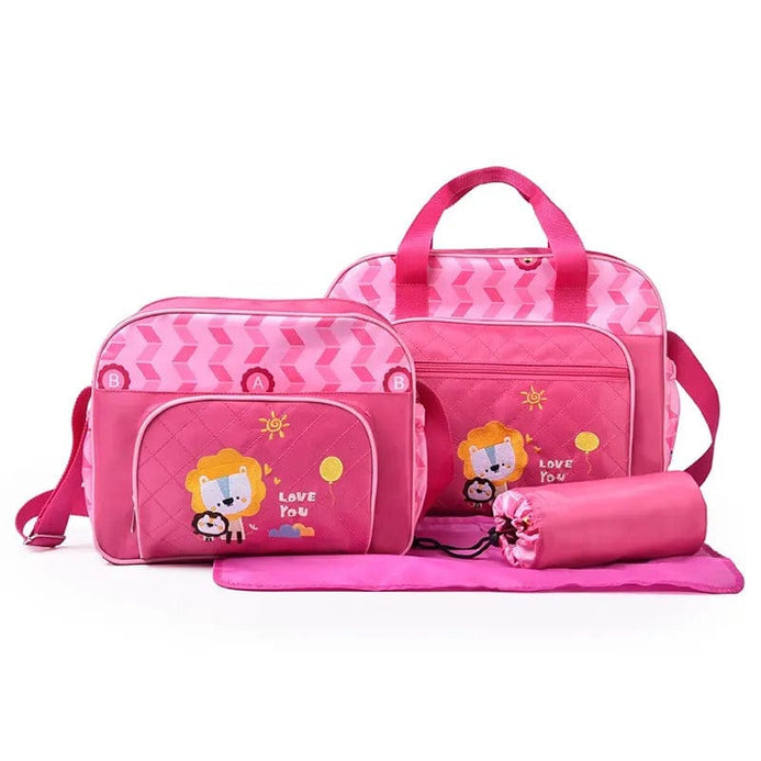 Pack of 4. Sunshine's Dark Brown Premium Diaper Bag Set - thoughtfully designed multi-utility mother bags that include two-size printed bags featuring durable zipper closures, a separate mini feeder bag, and a convenient waterproof nappy changing mat – all in one organized solution for your baby essentials.