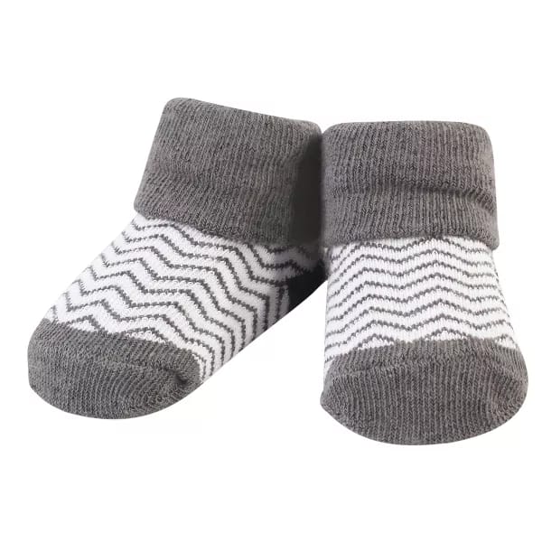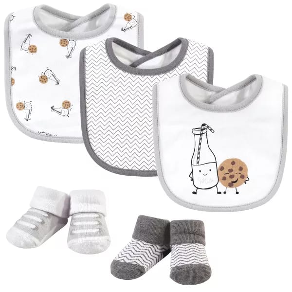 The information below is per-pack only Set includes coordinating bibs and socks Bib made with 100% cotton and socks made with cotton, nylon and spandex Bib made with multi-layered, gentle fabric to absorb drools and spills Optimal for everyday use Affordable, high-quality value pack.