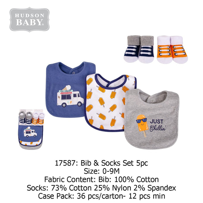 The information below is per-pack only Set includes coordinating bibs and socks Bib made with 100% cotton and socks made with cotton, nylon and spandex Bib made with multi-layered, gentle fabric to absorb drools and spills Optimal for everyday use use Affordable, high quality value pack