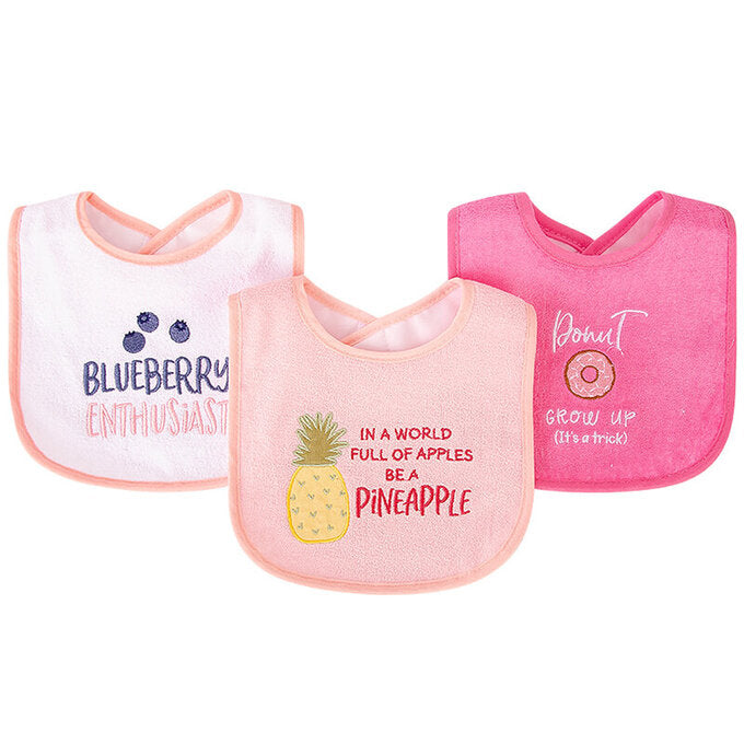 This pack of 3 fun drooler bibs are a great way to accessorize and keep your little one’s clothes clean! Made of cotton blend knit with PEVA backing. Bib measures about 6 inches from neck down.