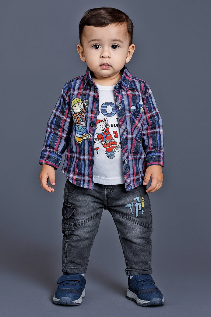 3 PC Blue Spring Autumn New Boy Cartoon Print Shirt, T-shirt, Pant Suit Three-piece Suit, Perfect for Outdoor SD6410E