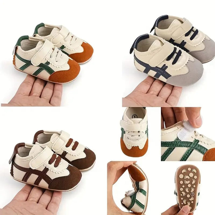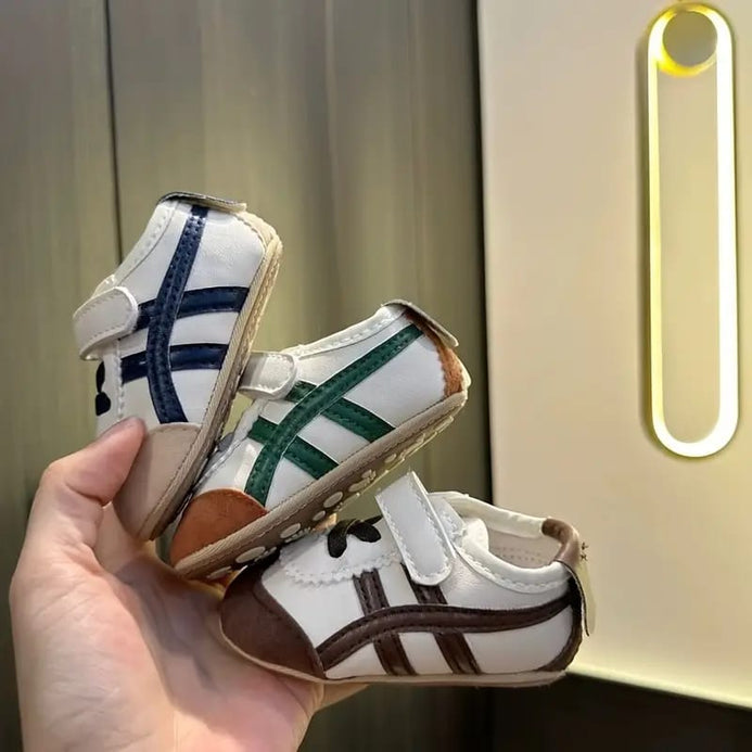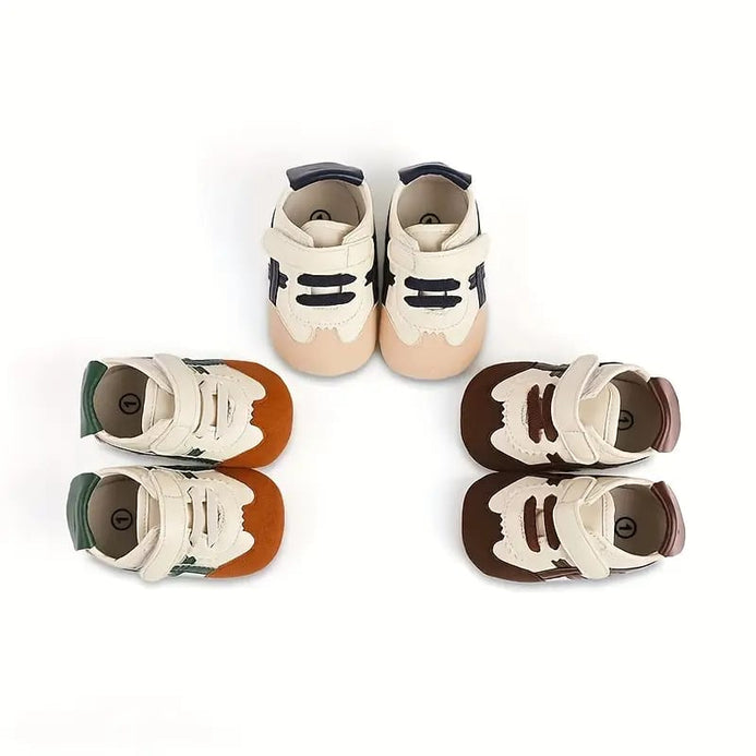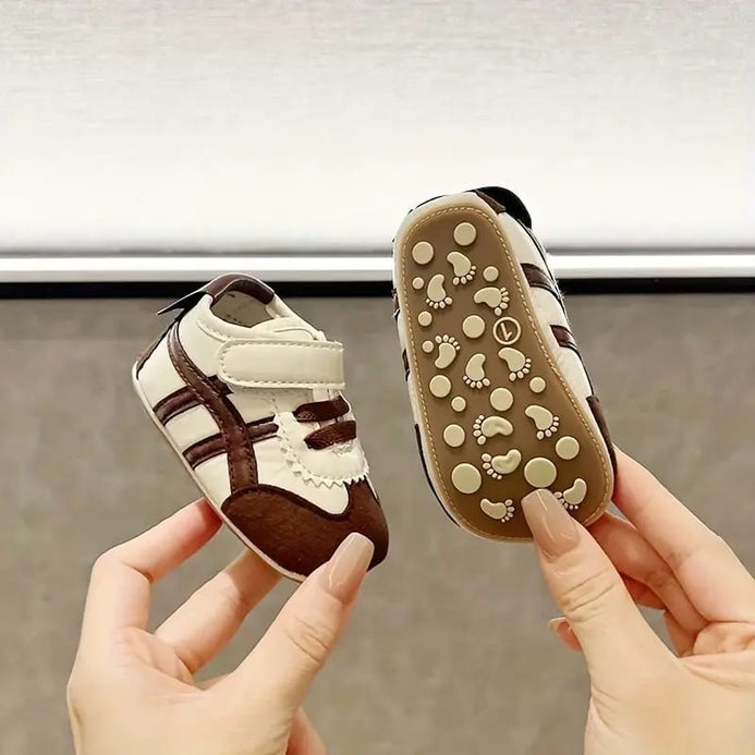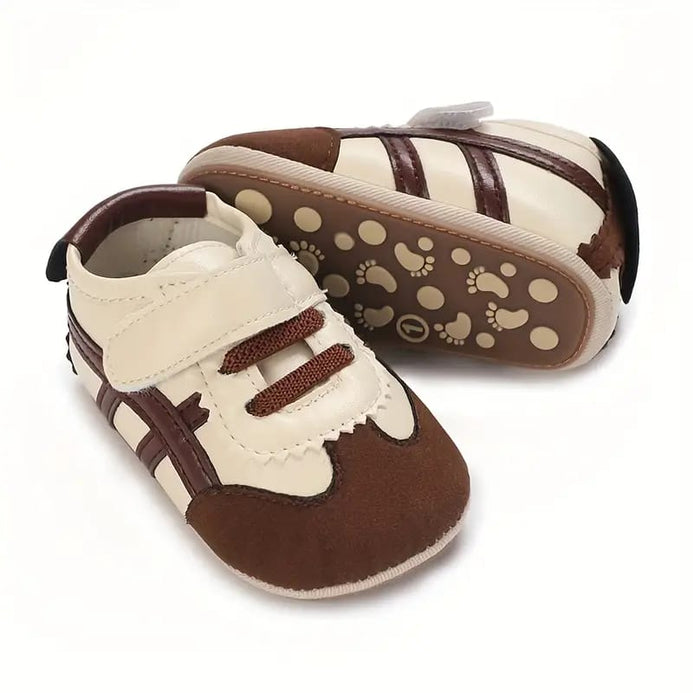 White & Brown Breathable British Style Baby Sneakers - Non-Slip Soft Sole, Mid-Top Design for Infants & Newborns, All-Season Outdoor & Daily Wear Shoes SH7169C