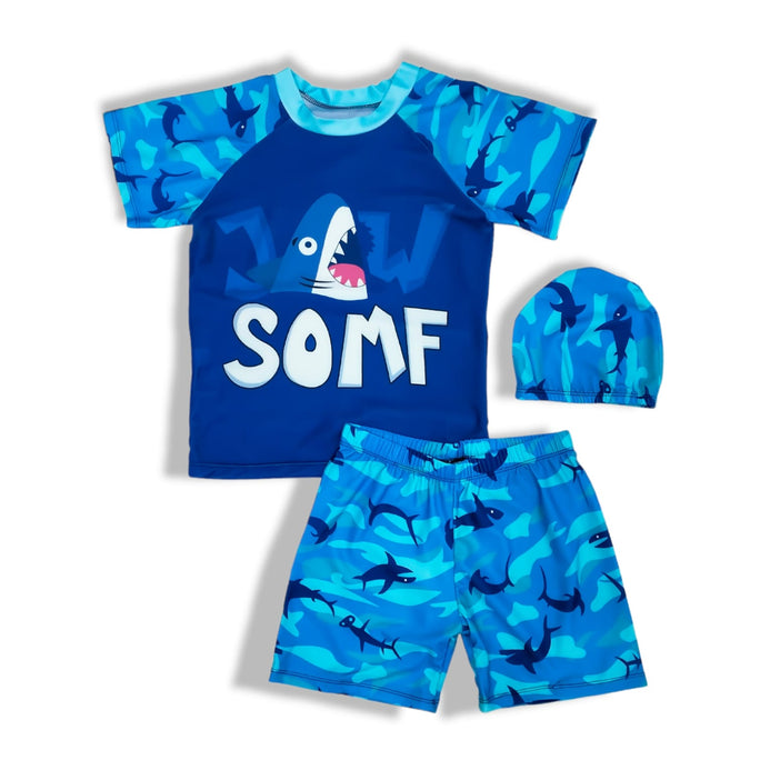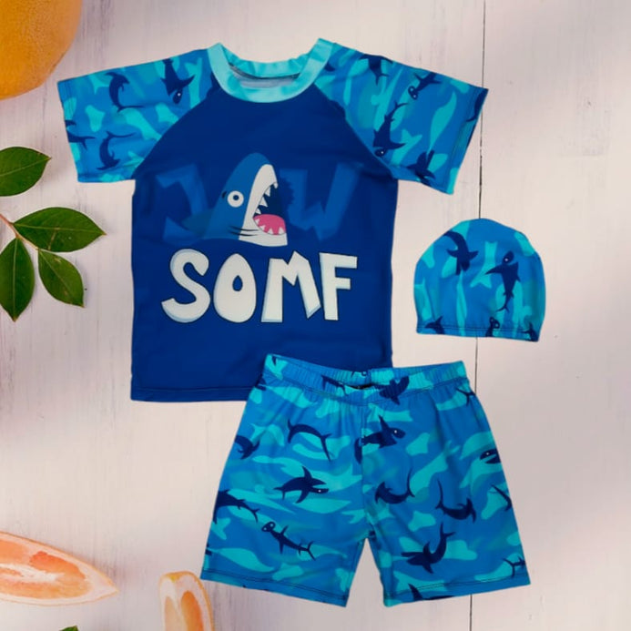 Boys Navy Blue Shirt & Short Swimsuit 2 PCs Set with Cap SWM6154A