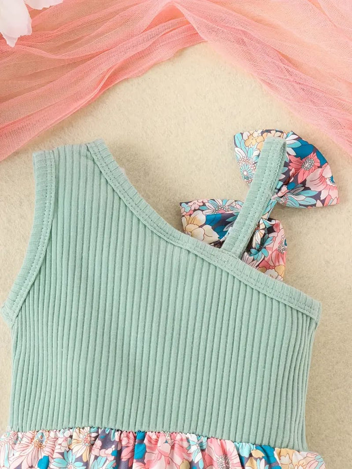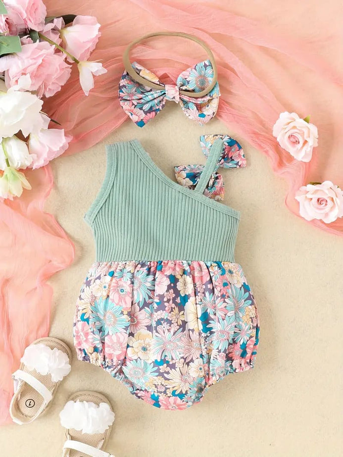 - Adorable Summer Floral One-Shoulder Romper with Matching Bow Headband for Baby Girls - Soft Cotton Blend, Machine Washable, Perfect for Outdoor BS6101D