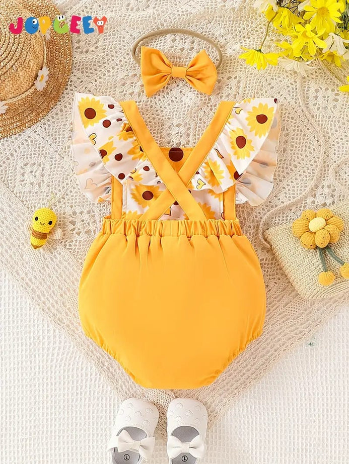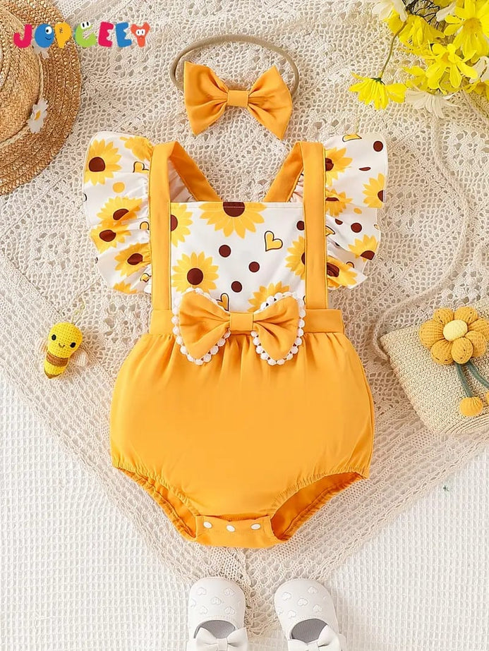 - Girls' Casual Cute Floral Print Random Pattern Lace Trim Bowknot Romper with Water Lily Edge, Summer Includes Hair Accessory, Perfect for Outdoor BS6140A