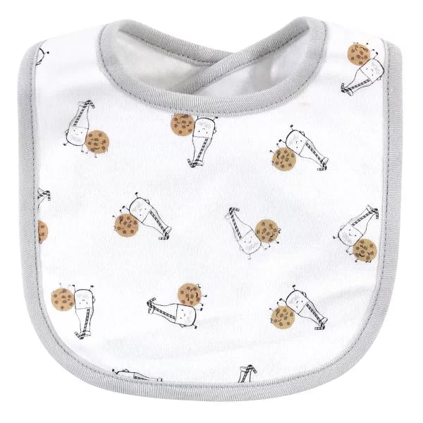 The information below is per-pack only Set includes coordinating bibs and socks Bib made with 100% cotton and socks made with cotton, nylon and spandex Bib made with multi-layered, gentle fabric to absorb drools and spills Optimal for everyday use Affordable, high-quality value pack.