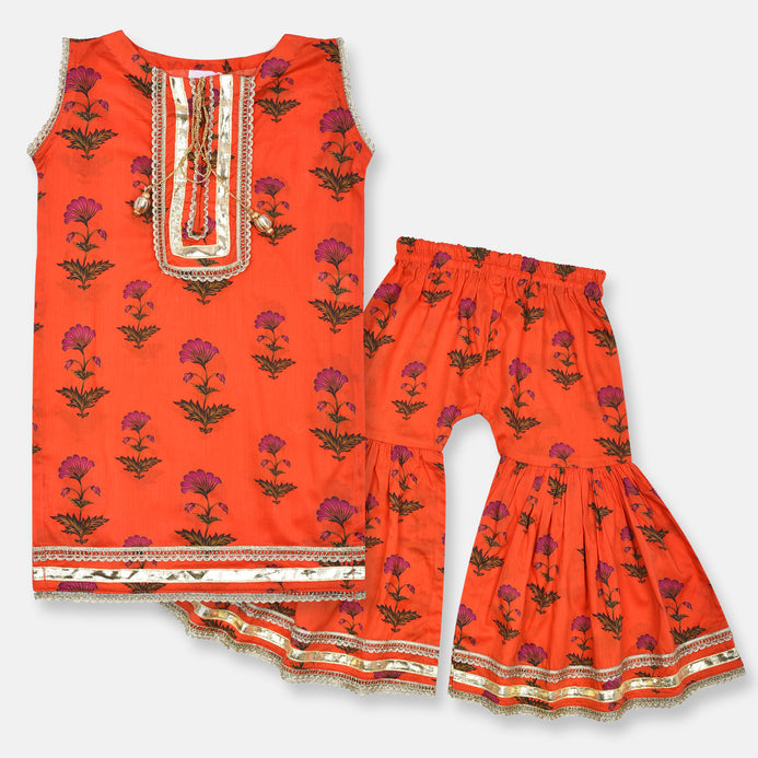 JF Orange Printed Girls Dress 2 Pieces Set FD6015