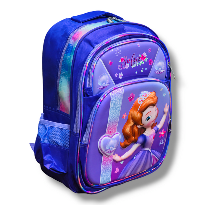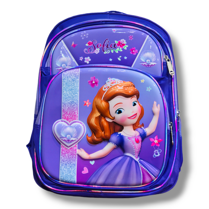This 16 inch Sofia school bag is the perfect way to keep your child's school supplies organized and their love of Sofia close by. The backpack features a spacious main compartment with enough room to fit books, notebooks, folders, and other essentials. There is also a front pocket for smaller items, and two mesh side pockets for water bottles or snacks. The backpack is made from durable fabric and features padded shoulder straps and a padded back for added comfort. The Sofia design is sure to turn heads, and your little angle will love carrying this bag to school every day.