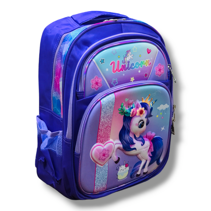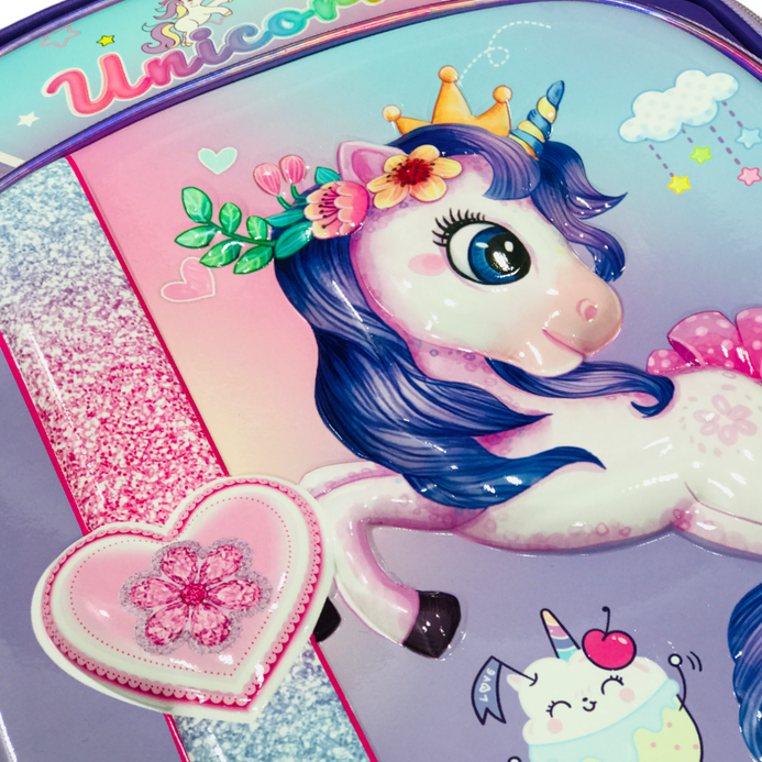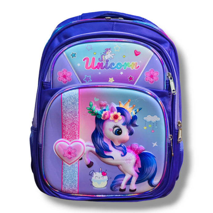 This 16 inch Unicorn school bag is the perfect way to keep your child's school supplies organized and their love of Unicorn close by. The backpack features a spacious main compartment with enough room to fit books, notebooks, folders, and other essentials. There is also a front pocket for smaller items, and two mesh side pockets for water bottles or snacks. The backpack is made from durable fabric and features padded shoulder straps and a padded back for added comfort. The Unicorn design is sure to turn heads, and your little angle will love carrying this bag to school every day.