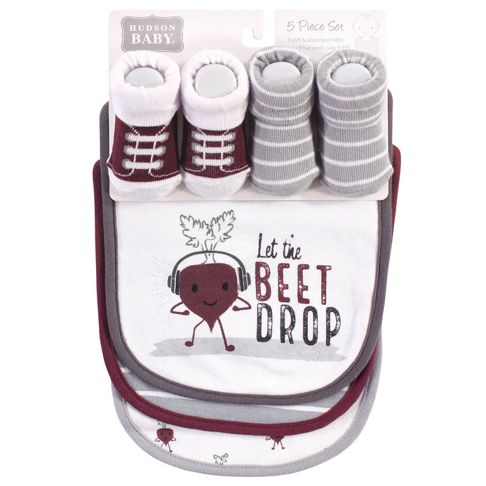 The information below is per-pack only Set includes coordinating bibs and socks Bib made with 100% cotton and socks made with cotton, nylon and spandex Bib made with multi-layered, gentle fabric to absorb drools and spills Optimal for everyday use Affordable, high quality value pack