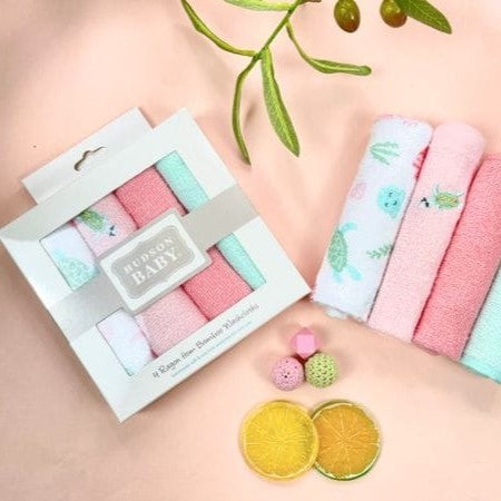 HB 4-Piece Washcloths are made of 70% Rayon from Bamboo 30% Polyester and measure 25x25cm, giving parents a large, soft washing accessories that will help make bath time easier. Machine washable for easy cleaning, these wash clothes have one embroidered animal cloth and three adorable coordinating colors. Perfect for taking when traveling or bringing to daycare.