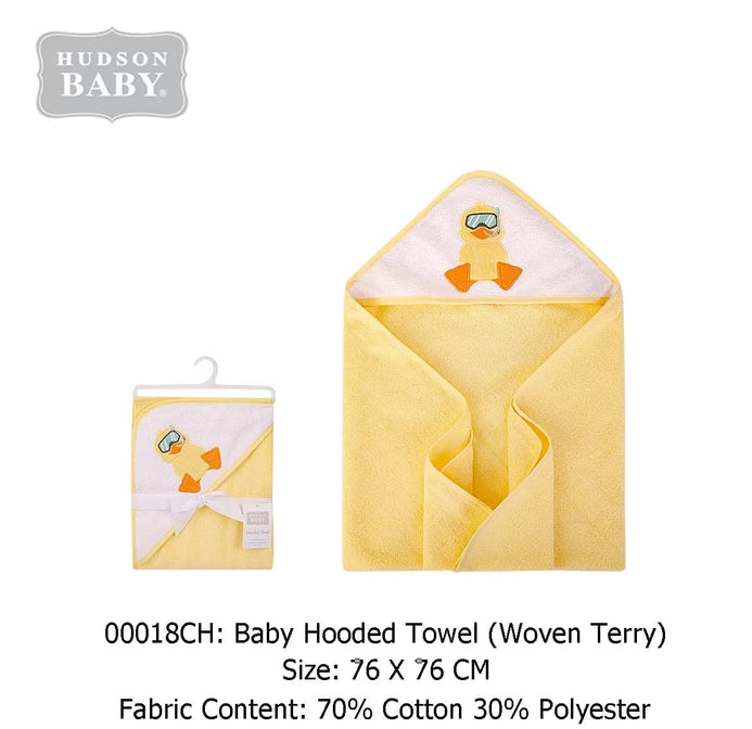 Hudson Baby character face hooded towels are made of 100% woven cotton terry and are available in a variety of adorable character face options. Our hooded towels are more than generously sized at 30x30 inches to cover baby head to toe after bath or swim time. Our fun designs and large towels are perfect for baby and toddlers.